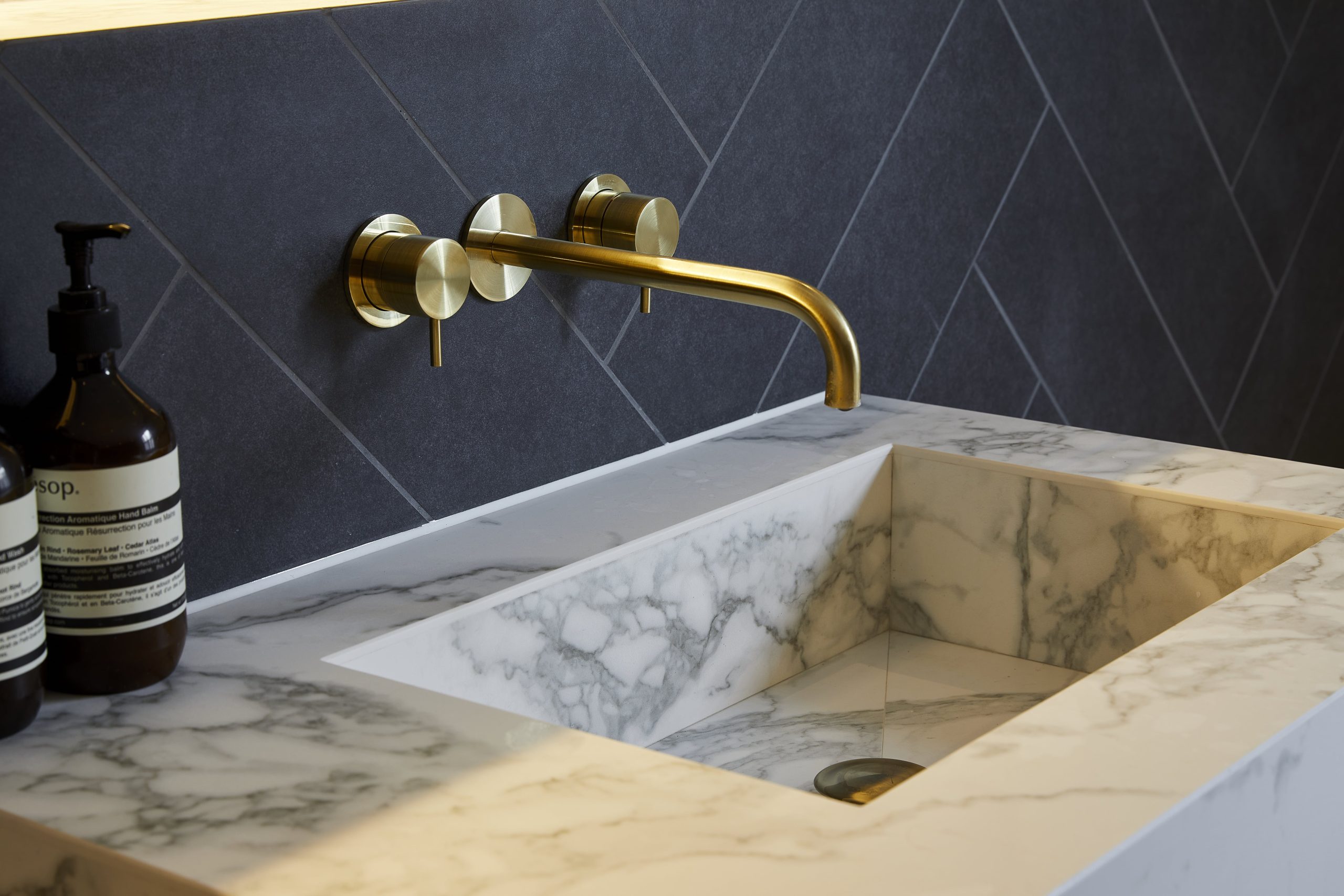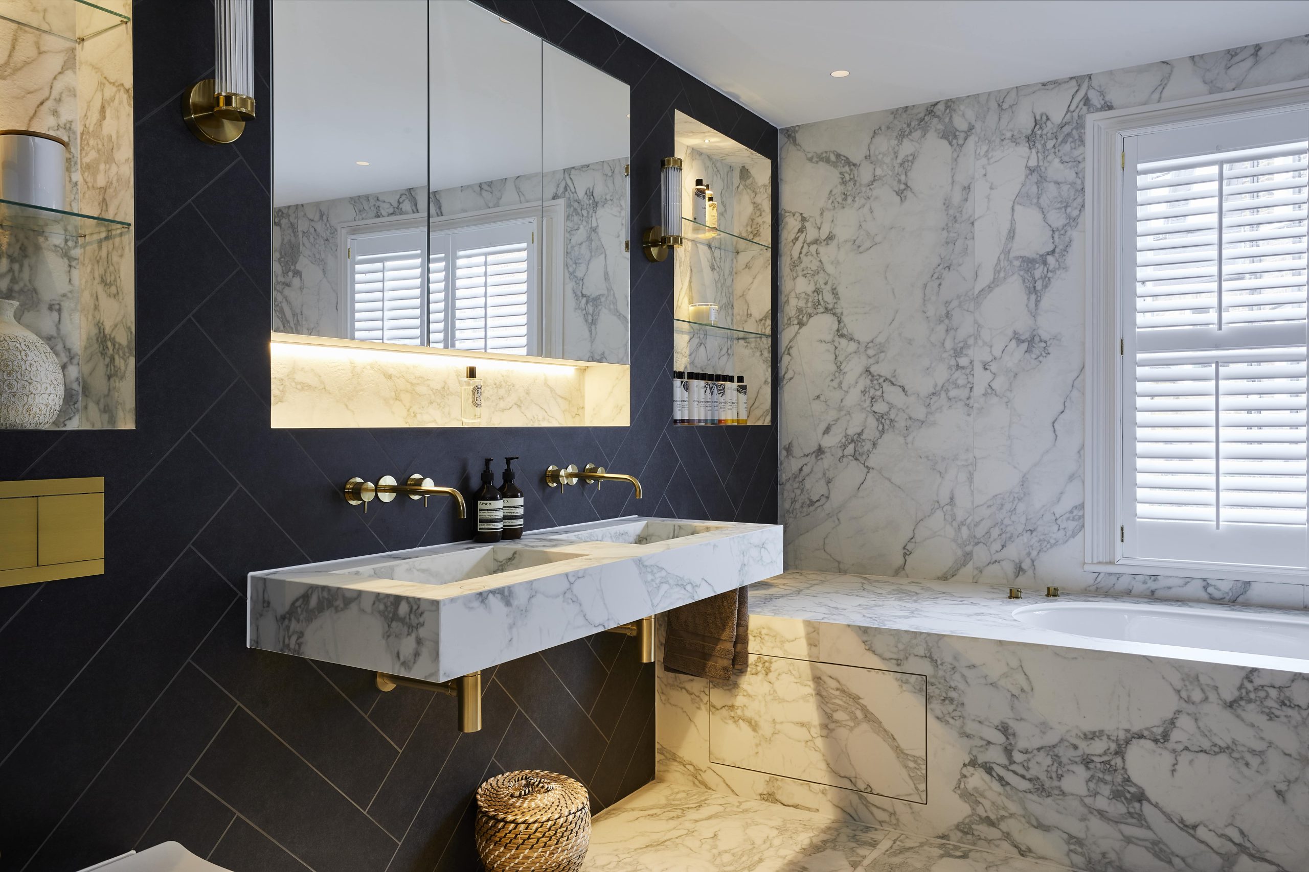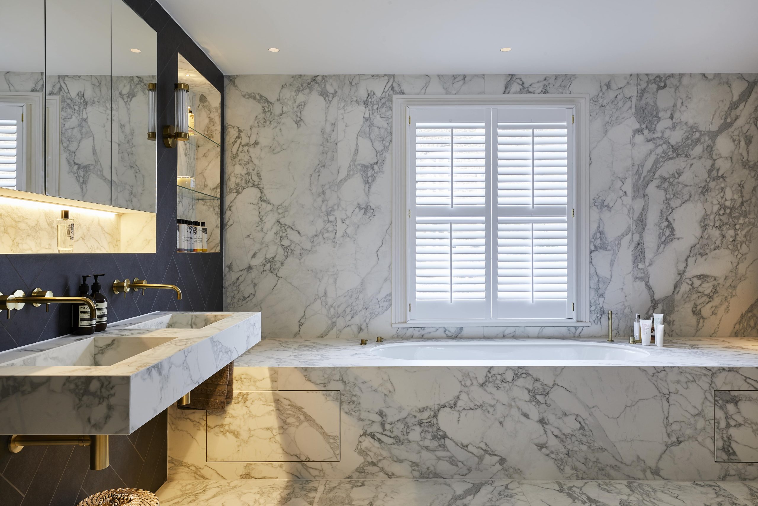 When designing this beautiful bathroom, Coliseum Arabascato porcelain slabs were used throughout to create a seamless design.  The 12mm slab was used for the bath surround to take the undermounted bath and 6mm slabs were used on the walls and floors in 1x3 metres.